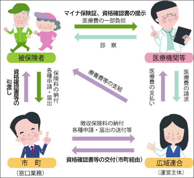 被保険者、医療機関等、市町、広域連合の4つのイラストが書かれています。被保険者は医療機関等で診療を受け、自己負担金を支払います。保険料を市町に納付します。医療機関は医療費を広域連合に請求します。市町は資格確認書等を被保険者に発行します。広域連合は医療機関に医療費を支払い、被保険者に高額療養費などの支払いを行います。他にもそれぞれの立場で役割があります。